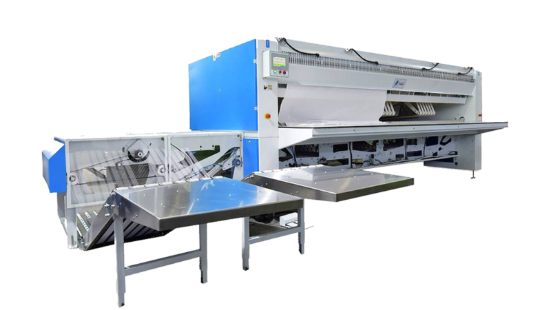 采用雙通道設計,可同時處理2件限定寬度的小件布草,產量可接近單通道模式的2倍,標配兩個堆垛機,可根據實際使用情況選擇做左/右出料或雙出料模式。